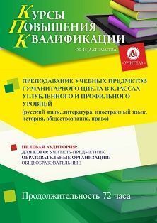 Преподавание учебных предметов гуманитарного цикла в классах углубленного и профильного уровней (русский язык, литература, иностранный язык, история, обществознание, право) (72 ч.)