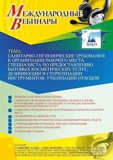 Международный вебинар Санитарно-гигиенические требования к организации рабочего места специалиста по предоставлению бытовых косметических услуг, дезинфекции и стерилизации инструментов, утилизации отходов