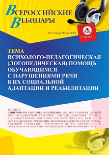 Вебинар Психолого-педагогическая (логопедическая) помощь обучающимся с нарушениями речи в их социальной адаптации и реабилитации