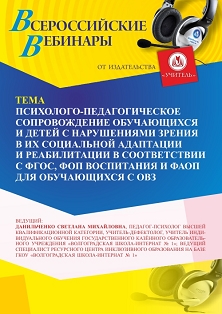 Вебинар Психолого-педагогическое сопровождение обучающихся и детей с нарушениями зрения в их социальной адаптации и реабилитации в соответствии с ФГОС, ФОП воспитания и ФАОП для обучающихся с ОВЗ