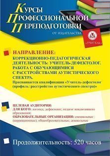 Коррекционно-педагогическая деятельность: учитель-дефектолог. Работа с обучающимися с расстройствами аутистического спектра. Присваивается квалификация Учитель-дефектолог (профиль: расстройство аутистического спектра) (520 ч.)