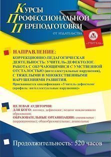 Коррекционно-педагогическая деятельность: учитель-дефектолог. Работа с обучающимися с умственной отсталостью, с тяжелыми и множественными нарушениями развития. Присваивается квалификация Учитель-дефектолог (профиль: интеллектуальные нарушения) (520 ч.)