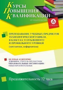 Преподавание учебных предметов технологического цикла в классах углубленного и профильного уровней (математика, информатика) (72 ч.)