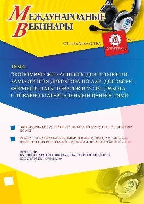 Международный вебинар "Экономические аспекты деятельности заместителя директора по АХР: договоры, формы оплаты товаров и услуг, работа с товарно-материальными ценностями"