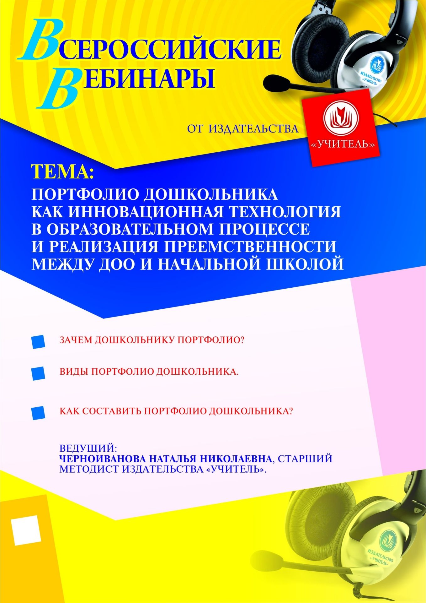 Приглашаем воспитателей и руководителей ДОО, методистов, старших воспитателей и других специалистов ДОО, учителей начальных классов, педагогов дополнительного образования принять участие в offline-вебинаре «Портфолио дошкольника как инновационная технология в образовательном процессе и реализация преемственности между ДОО и начальной школой».