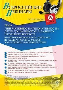 Вебинар Гиперактивность (гипоактивность) детей дошкольного и младшего школьного возраста: причины возникновения, признаки, психодиагностика, методы эффективного взаимодействия