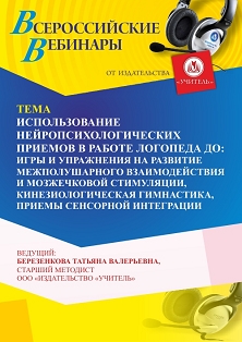Вебинар Использование нейропсихологических приемов в работе логопеда ДО: игры и упражнения на развитие межполушарного взаимодействия и мозжечковой стимуляции, кинезиологическая гимнастика, приемы сенсорной интеграции