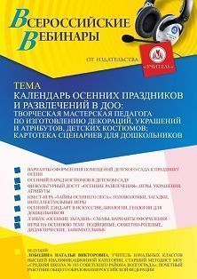 Вебинар Календарь осенних праздников и развлечений в ДОО: творческая мастерская педагога по изготовлению декораций, украшений и атрибутов, детских костюмов; картотека сценариев для дошкольников