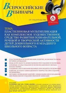 Вебинар Пластилиновая мультипликация как комплексное художественное средство развития познавательной, речевой и творческой активности детей дошкольного и младшего школьного возраста