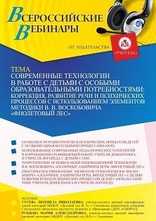 Вебинар Современные технологии в работе с детьми с особыми образовательными потребностями: коррекция, развитие речи и психических процессов с использованием элементов методики В. В. Воскобовича “Фиолетовый лес”