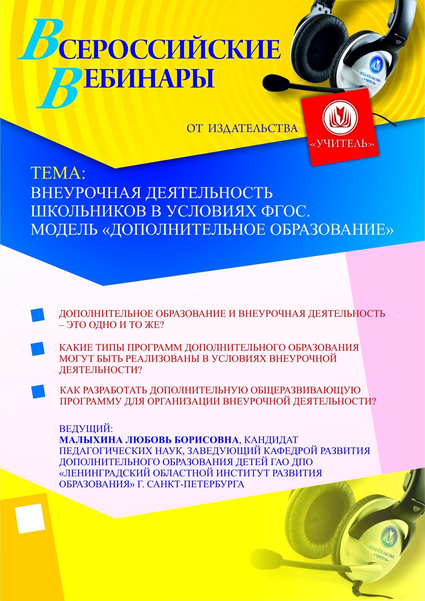 Приглашаем руководителей организаций общего и дополнительного образования, руководителей и методистов муниципальных методических служб, учителей, педагогов дополнительного образования принять участие в offline-вебинаре «Внеурочная деятельность школьников в условиях ФГОС. Модель “Дополнительное образование”».